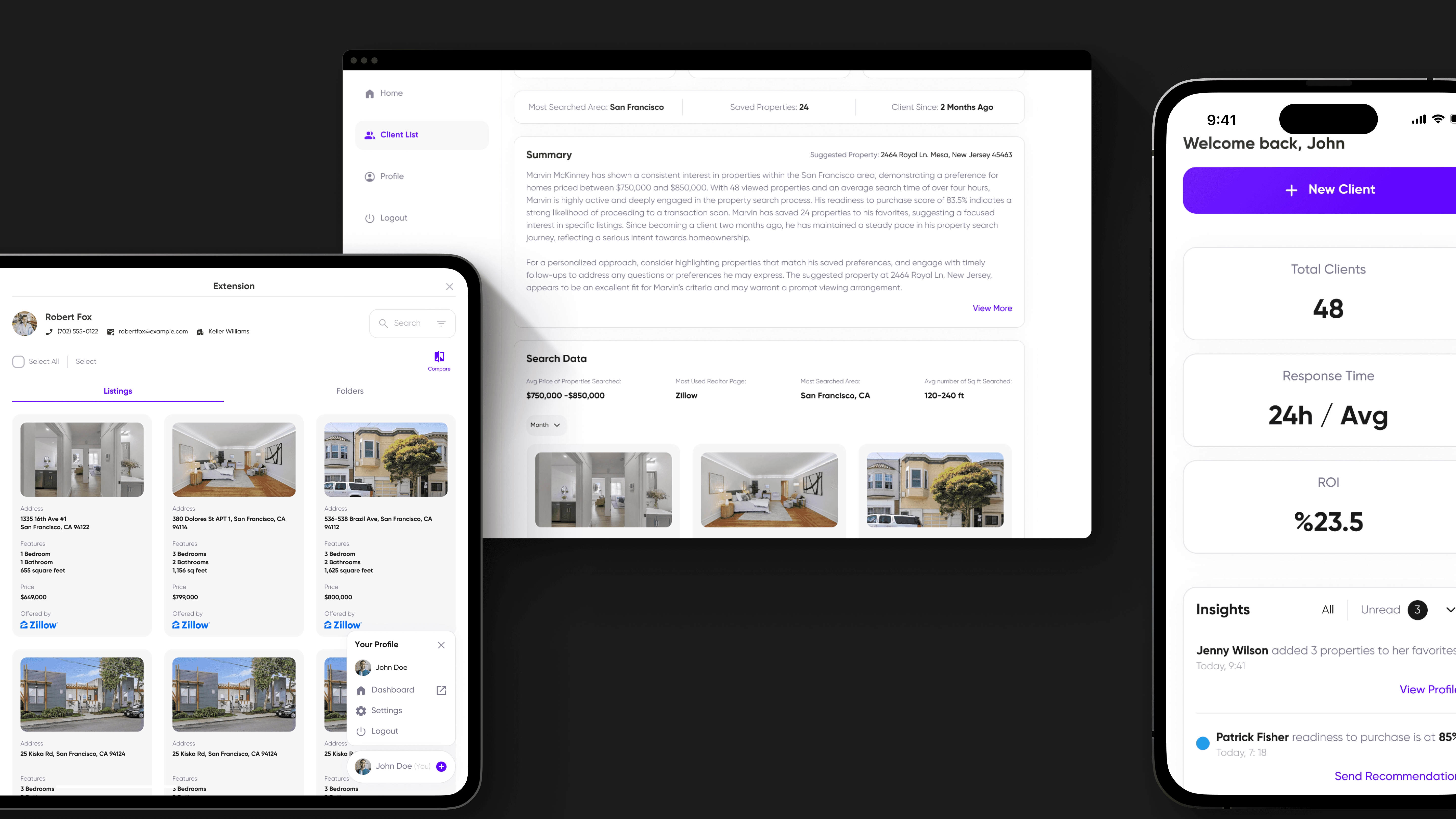A real estate SaaS platform rebuilt for closing power. We restructured two complementary products: an AI-powered dashboard for agents and a Chrome extension for buyers. Designed to unify decision-making, compress time-to-close.